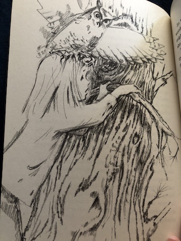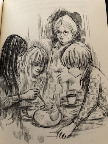 However, he doesn’t survive the mission himself. He is killed by enemy fire, but Lady Brereton reveals that he knew he was ill and dying anyway. One of the pen-and-ink pictures in the book is actually of Sir Rollo after he got shot, and I was a little surprised that the book would show a blood-stained dead body in that way. It’s not overly graphic, even in the illustration, and because it’s a black-and-white drawing, it’s a less alarming than seeing someone with a red blood stain. Still, I think sensitive readers should be aware that it’s there. The book doesn’t sugarcoat the nature of war at all.