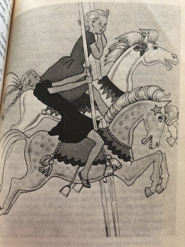 That last part didn’t sound very reassuring to me, the reader. However, Rainbow is able to get his harness on Lucky. When Rainbow gets up on Lucky’s back to ride him home, Lucky starts running in the opposite direction from home. Lucky tries to throw Rainbow off or scare him at first, but when he realizes that Rainbow isn’t scared and loves being on his back, Lucky begins to calm down and enjoy the ride himself.