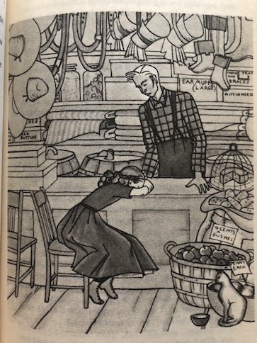Handie goes to see Mrs. Blooman about arranging to buy meals from her. When he gets there, Mrs. Blooman is immediately suspicious about his reasons for visiting, bracing herself for some complaint, because that’s usually why people come to see her. She invites Handie inside, and he compliments her about how neat her house is. His compliments soften her a little, but she’s still suspicious and raises the question with him about whether or not he’s come to complain about something. Handie asks her what he could complain about. Mrs. Blooman isn’t sure, but people do often complain to her, mostly about Lucky getting into their pastures. (As established earlier, this is her fault.) Handie says he’s not complaining about anything and that he thinks she’s a good neighbor. He says he’s looking forward to living next door to her when he’s old enough to take full control of his farm, although he speculates that she might have married and moved away by then. Mrs. Blooman is surprised by that comment, but Handie says he doesn’t see why she shouldn’t marry. To his mind, the only thing stopping her is her obvious capability and independence, that she seems to be managing things on her own and wouldn’t be interested in marriage. Handie is young yet, too young to get married himself, but he offers this thought about what men are looking for in a wife: