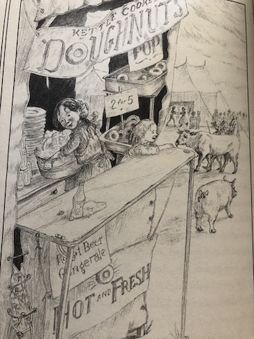 Betsy has other adventures with Molly and her other new friends while living with the Putneys. When Molly’s mother becomes ill and has to go to the hospital, Molly is upset because she will have to move in with some cousins in the city who don’t really want her. Having been in this type of situation before herself, Betsy is immediately sympathetic, and she gets her relatives to agree to let Molly stay with them. Molly becomes like a little sister to Betsy, and they share in other adventures together. Along with some other girls from their school, they form a sewing circle to make some clothes for a poor boy at their school who lives with a stepfather who spends all of his money on alcohol. The book doesn’t shy away from describing how the boy is neglected, and the girls in the sewing circle are moved to tears when they go to the boy’s house to deliver the new clothes and see the circumstances he lives in. The Putneys also become concerned about the boy’s welfare, and they help arrange for him to be adopted by a man they know who has been talking about adopting a boy. Later, for Betsy’s birthday, Betsy and Molly go to the fair with some neighbors, but they are accidentally left behind when the people who were supposed to give them a ride home had to leave to tend to an emergency. Betsy is terrified, but with Molly to look after, Betsy manages to keep her head and think of a way to earn some money so they can buy train tickets home.