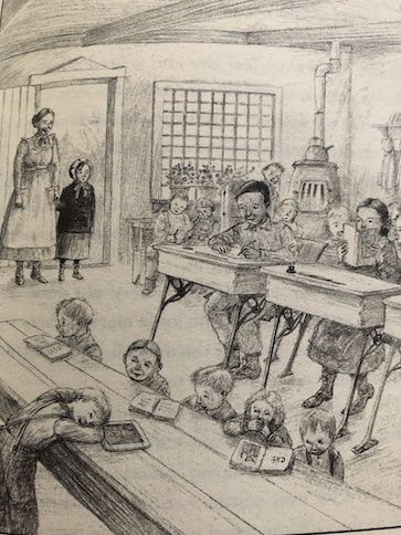 She almost misses the schoolhouse because it’s a much smaller building that she expected. Her school in the city was a multi-story building, but the local school is just a small, one-room schoolhouse. Fortunately, the teacher has been expecting her and looking out for her arrival, so she calls Betsy inside as she passes. Betsy is astonished at how few students there are, compared to her old school, and because there are so few, all the grades are just in that one schoolroom.
