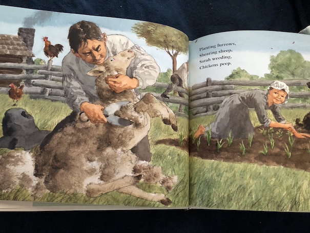 Various family members carry out different household chores, and as the story continues, readers see how everything they do is not only a part of the family’s daily life but also contributes to the creation of the new dress. The family raises sheep, so they must start by sheering the sheep to get the wool for the dress.