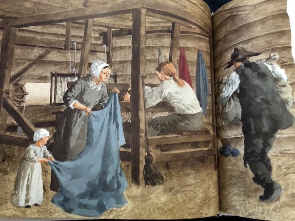 I did appreciate the way the book showed aspects of daily life in the 18th century. Some of them are explained in the author’s note, but there are also other parts of daily life to notice in the pictures. One of my favorite ones was the way that the youngest child in the family is tied to her mother or older sister’s apron strings to keep her from wandering away and getting into trouble while they’re doing their chores.