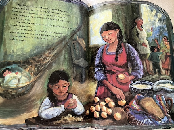 The pictures in this book are soft, colorful, and lovely. Although the family is poor, they appreciate the small pleasures in their lives, like making the tortillas and the yearly appearance of the beautiful butterflies. I did also feel a little sorry for the butterflies the pigs ate, but the story doesn’t dwell on that part too much.