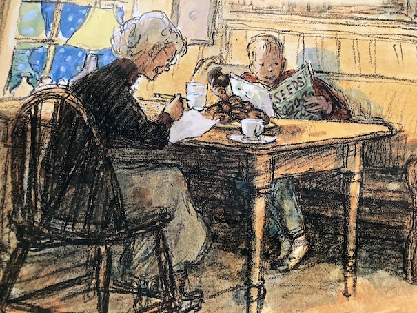 I also thought the addition of Parker to the story helps to show the passing of time and the growth of the trees because the boy grows a few years older during the time when they’re letting the trees grow bigger. By the time they’ve sold their first crop of Christmas trees, Parker is getting old enough to take more of an active role in planning the next crop.