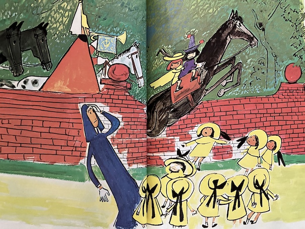 I was seriously worried about the horse after they forget to feed him and he helps himself to random plants in the garden, especially when they find him with his feet up in the air. Fortunately, everything works out okay, which is characteristic of Madeline books, too. How the trustees of Madeline’s school will react when they find out that the girls now have a pet horse, since they raised a fuss earlier about the girls having a dog, is anyone’s guess, but the story doesn’t worry about that, either.