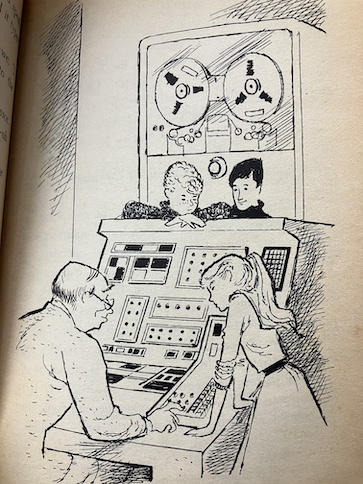 Joe asks Professor Bullfinch how the Minaic works, and he explains that they can ask it questions through a microphone. The computer prints out answers with an electric typewriter. Irene asks if they can ask it a question to see how it works, and she asks the Miniac a question from their homework. Joe is amazed at how quickly the computer answers the question, and Professor Bullfinch explain a little more about how computer work, with a memory unit that stores information. He says that facts are stored on magnetic tape. (This was true at the time this book was written, although 21st century computers are constructed differently, in ways that allow them to be made much smaller than 1950s computers. What he says next about the nature of computer intelligence is still true, although I’m going to have some things to say about AI in my reaction section.)