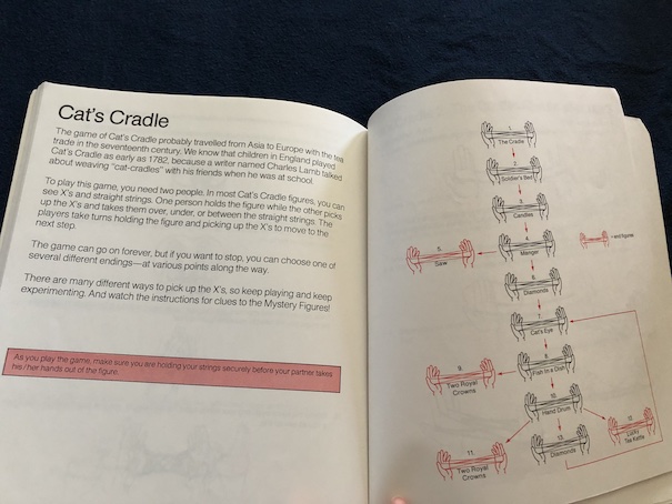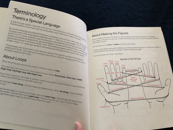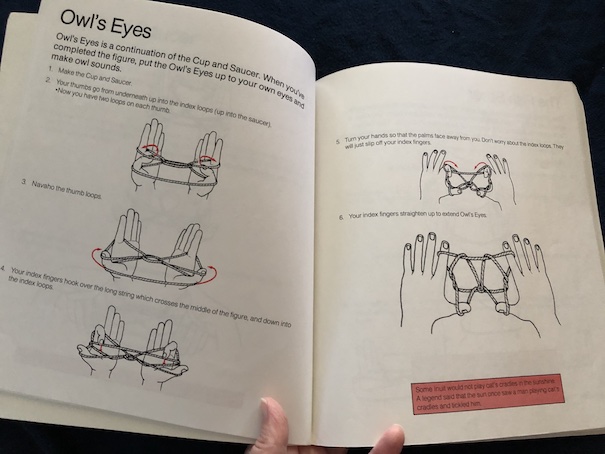 Back when I was in middle school, I went through a phase where I was really into cat’s cradle. I’m one of those people who like to have something to fiddle with in their hands, and it was easy to carry a loop of string in my pocket. If I lost the string, I could always make another string loop and carry that. This was the book that I used to teach myself how to make cat’s cradle string figures.