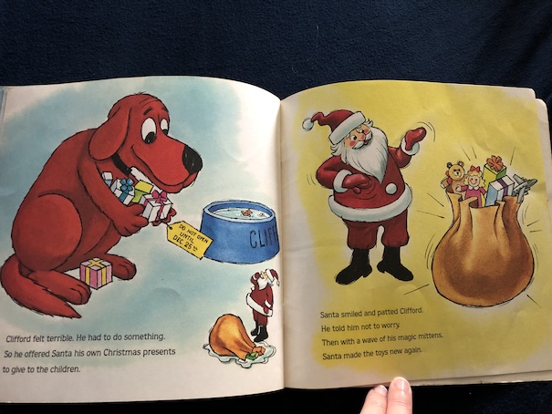 The toys fall into Clifford’s water bowl, but Santa fixes them with his magic. No harm done, and it’s a Merry Christmas after all!