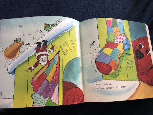 When Santa comes, he lands on the roof of Clifford’s dog house and accidentally falls into Clifford’s stocking, dropping his sack of toys. Clifford has to rescue him.