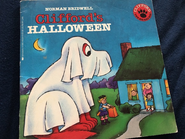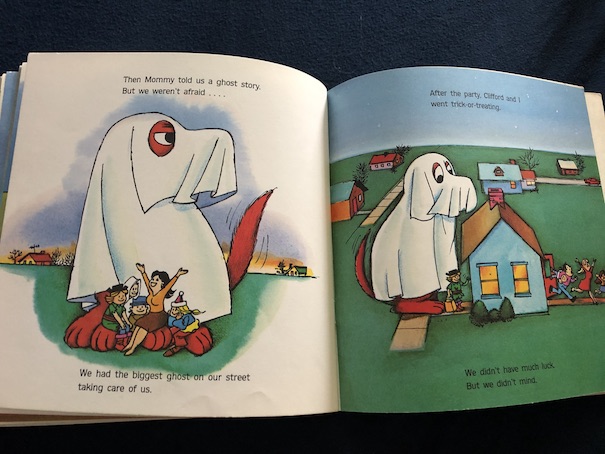 Last Halloween, she considered various costumes for Clifford, but Clifford decided that he wanted to be a ghost, covered with a giant sheet. (I love how they say that nobody could guess who the giant ghost is, like there could be someone else in the neighborhood that big.)