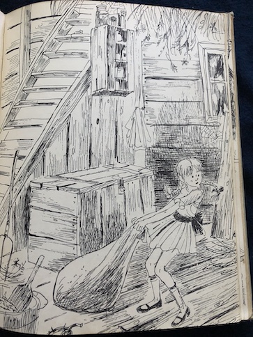 Once they get into the house, Handie says that they should make a fire in the kitchen fireplace “to drive the spooks out of the house.” The story says that neither of them really believes in “spooks” as in ghosts, but the house has a lonesome atmosphere from being empty for so long, and they know that a cheery fire will make the place feel more cozy and lived-in. Handie sends Rainbow out into the yard to pickup some chips and kindling from the yard litter that they can use to start a fire.