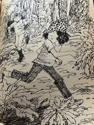 I remember reading this book when I was a kid, and I loved it because I always loved treasure hunt books! There are parts of the treasure hunt that readers can solve along with the characters in the story, although it’s not one of those stories that pauses to ask readers if they’ve solved parts before the characters have. It’s just that the information necessary to solve each part of the treasure hunt is given in the story and shown in the pictures, so readers have the opportunity to think what the next step should be along with the characters or before the characters announce what they’ve figured out. Some of the clues point to features of the camp itself, like the names of the trails around the camp, but the story does provide that information to the readers, so there’s nothing that the characters know that the readers don’t. Other clues use pop culture references, like Donald Duck, because their camp counselor is a Disney fan and has items with Disney characters on them.