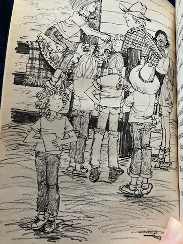 This book follows an earlier book in the series, The Case of the Cool-Itch Kid, while Dawn is staying at her summer camp, Camp Wild-In-The-Woods. Her friend from school, Jill Simon, is at camp with her, and they’ve made friends with another character from the earlier book, Lizzie Lee, who started out as a rival/antagonist for Dawn. Both Dawn and Lizzie like mysteries and being private detectives, and they’ve bonded over that. There is still an element of rivalry between them, but it’s a friendlier rivalry than when they first met each other.
