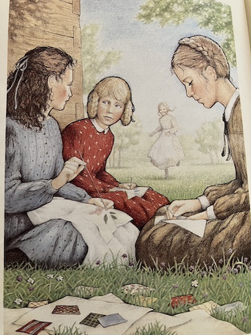 Mary also brings up the topic of whether or not Miss Winston will move on. She’s been going to Powderkeg School for four years, and every year, the previous teacher moves on, and they get a new one. Although Kirsten initially had trouble with Miss Winston, she has become fond of her, and she wouldn’t like to see her go. With all the other changes happening in Kirsten’s life, she doesn’t want any other major changes now. Kirsten suggests to the other girls that they turn their quilting project into another friendship quilt for Miss Winston, signing it like her family members signed their quilt. The other girls debate about whether they could manage to finish a quilt like that by the end of the summer term. Lisbeth thinks they could, but Mary doesn’t want to rush the project because the best part of making a quilt is sewing it with your friends.