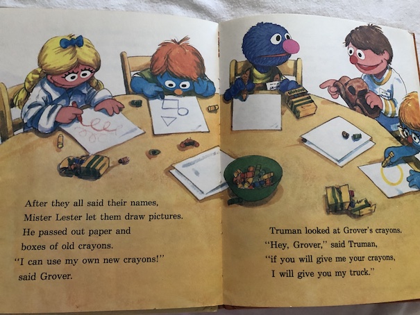 Grover’s attempts to get the other kids to like him cause him to agree to do things that he doesn’t really want to do. When a boy named Truman likes Grover’s nice, new crayons and offers to trade him his old toy truck for the crayons, Grover doesn’t really want to make the trade, but he agrees because he wants Truman to like him.