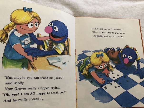 Seeing Grover sad and upset, a girl named Molly asks him what’s wrong. Grover explains everything that’s been happening to her, and she says that she’ll play with him and cheer him up. Molly doesn’t know how to play jacks, which is Grover’s favorite game, but she says that she’d like to learn, and Grover enjoys teaching her.