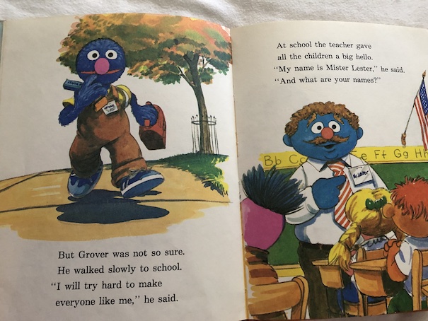 This nostalgic picture book about a child’s first day of school features Grover, one of the characters from the Sesame Street tv show.