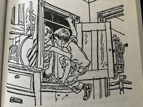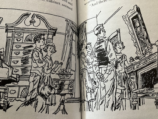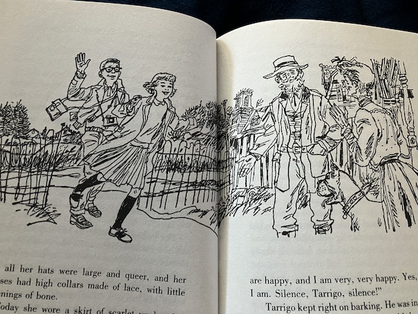 This is one of those children’s books that also references other children’s books. Because generations of children have visited Winterbloom, Jo finds old children’s books on the shelves there, like The Five Children and It by E. Nesbit and a Nancy Drew book from the 1930s. When Jo reads The Five Children and It, she reads a part about how people can make themselves wake up at a particular time without an alarm clock by really focusing on the time they want to wake up before they go to bed. I haven’t read this book yet, but I have done that before, made myself wake up at a particular time because I had it in my mind that was when I wanted to get up. It does seem to work at least sometimes, although The Five Children and It says that it only works if you really, really want to wake up at that particular time. If you don’t really want to get up, it won’t work. When Jo reads the Nancy Drew book, she tells Granty that she’s surprised that Nancy Drew is that old, and Granty tells her how the Nancy Drew books are periodically rewritten to update them with the current time and habits, changing language and technology to be current. This is true, and I’ve talked about that on this site before. As this story notes, in the original books, people were driving roadsters and using typewriters, and in the updated versions, they have sports cars and computers.