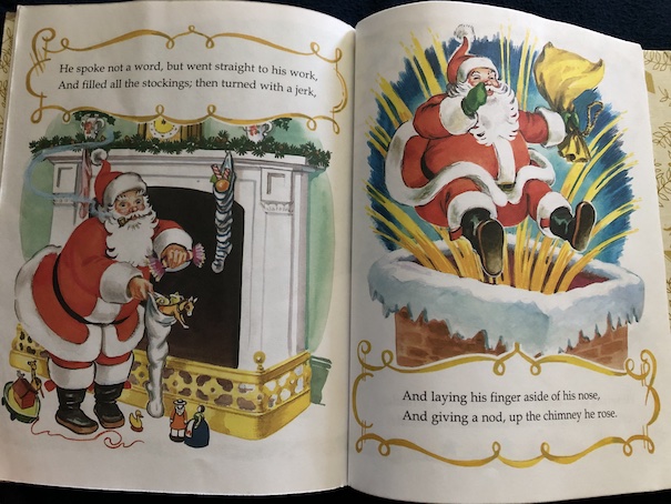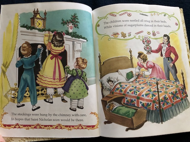 This Little Golden Book makes a cozy and pleasant bedtime story for Christmas Eve with its images of a 19th century/Victorian family hanging up their stockings and going to bed on Christmas Eve with the anticipation of the sweets, presents, and fun of the next day. Then, the father of the family is suddenly woken when he hears Santa Claus arriving.