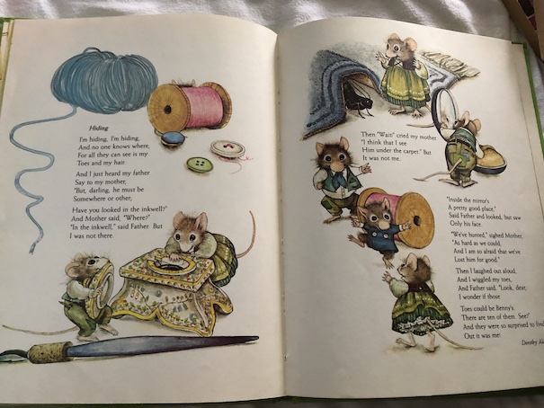 Wild Beasts by Evaleen Stein – About children pretending to be animals. Choosing by Eleanor Farjeon – About choosing between various nice things. Hiding by Dorothy Aldis – A child hides while his parents search for him. My mother often quoted from this poem when we were kids and she was looking for one of us. “I’m hiding, I’m hiding, and no one knows where …” The Swing by Robert Louis Stevenson – I think of this poem whenever I’m on a swing. Bedtime by Eleanor Farjeon – Children making excuses to stay up later.