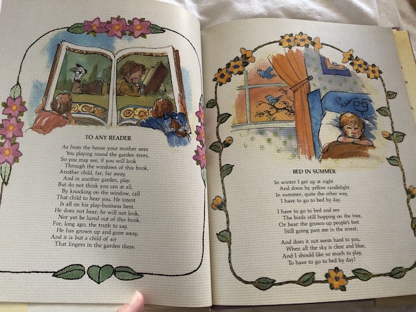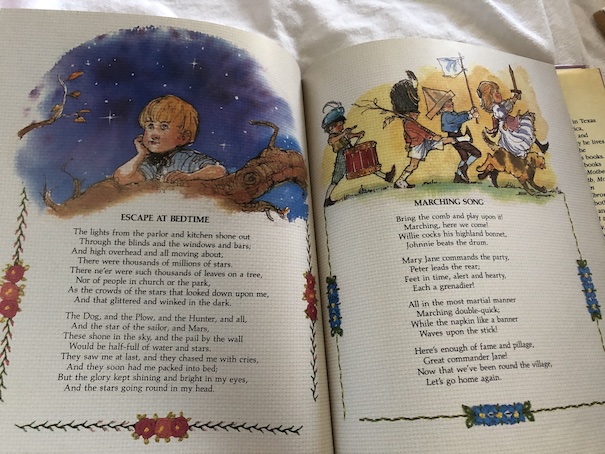 However, my mother’s favorite children’s poem is Bed in Summer because it reminds her of her own childhood and having to go to bed while the sun was still shining in summer and other children in the neighborhood were still playing outside. (I didn’t have this experience when I was growing up because I never lived in a place that had daylight savings time, which changes the clocks by one hour, providing an extra hour of daylight before sunset. Arizona is very hot, so there’s a benefit for doing things after the sun has set, and few people have any interest in pushing back time to maximize the scorchingly hot daylight hours. My childhood memories include going to parks with my parents after the sun set and being put to bed after we got home.)