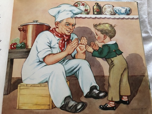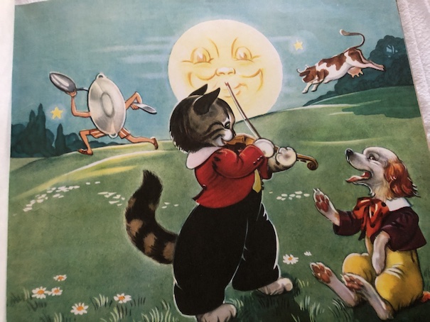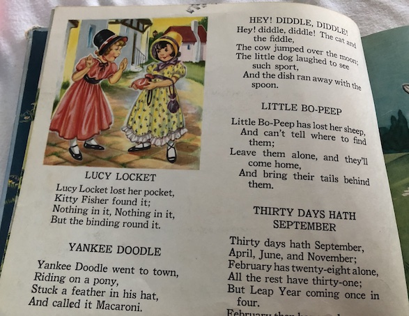 This was one of my first books of rhymes and poems as a child. We’ve had this book for as long as I can remember. I always loved the illustrations in the book, which are realistic in style, and like the illustrations in old Kate Greenaway books from the late 19th century, showing children in clothes that would be appropriate for the early 19th century, with high waists and short jackets. I suspect that Kate Greenaway’s work may have been some of the inspiration for the illustrations in this book. Some of the illustrations are small ones that appear in corners of the pages, surrounded by the text of the rhymes. Other illustrations take up a full page. All of them are full color illustrations.