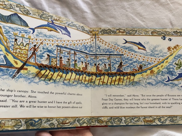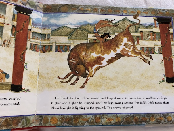 I knew at the beginning of the story that there couldn’t be a happy ending because I already knew what happened to the real island of Thera, now called Santorini. The island was largely destroyed by a volcanic eruption during the Minoan period, a cataclysm that may have sparked the legend of the sunken island of Atlantis. However, this story does not mention Atlantis, instead using the statue of a goddess found in the remains of the palace of Knossos as inspiration. In spite of the ending, I wouldn’t call this a sad story. The book doesn’t dwell on the aftermath of the destruction of Thera, and we don’t actually see much of the civilization of Thera, so there isn’t much for us to miss when it’s destroyed. The colorful pictures throughout the book are beautiful and actually feel rather cheery.