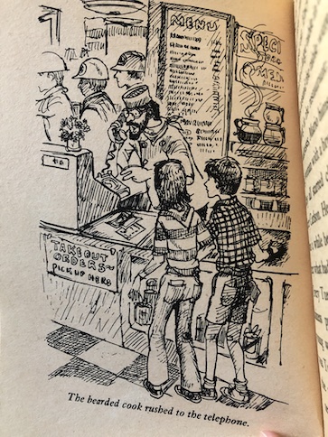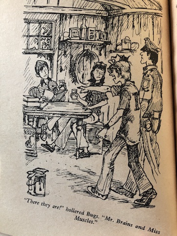 Encyclopedia and Sally go to a restaurant to order a pizza for lunch. While they’re waiting for their pizza, someone attacks the owner’s daughter in the ladies’ room and steals the money she was going to take to the bank. The owner’s daughter is very strong, and it must have taken someone very strong to overpower her and knock her unconscious so quickly and easily. It doesn’t seem likely that it would be a woman, but people would have noticed if a man had gone into the ladies’ room. Sally figures out the answer to this one, but it isn’t likely that modern readers. I didn’t get it when I was a kid, either, because the solution is based on an old piece of etiquette in restaurant seating that I don’t think people observe anymore.