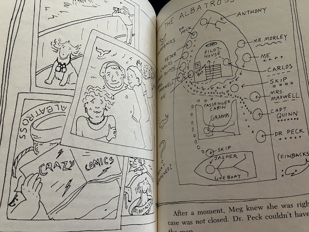 The group enjoys watching the whales, although Meg’s grandfather has to go lie down for a while because he’s seasick, and lazy Jasper spends his time reading comic books in the lifeboat. When they encounter a storm, and everyone goes into the cabin to get out of the rain, they discover that the map is missing!