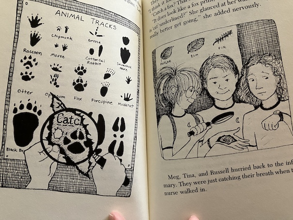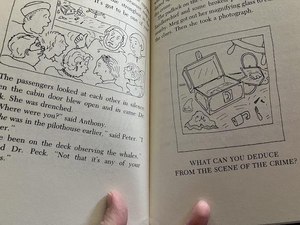 One morning, she leaves them a note saying that she has a dentist appointment, but she wants them to go to the library and find something valuable that she’s hidden there before the library opens at noon. Readers follow along with the clues that Alice has left for them to solve and the pictures in the book, seeing if they can solve each part of the mystery along with Meg. In keeping with the library and book theme of the story, the clues are based around books, particularly Sherlock Holmes books.