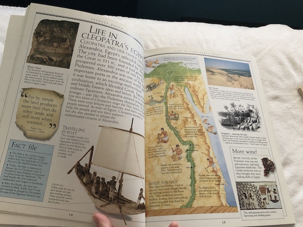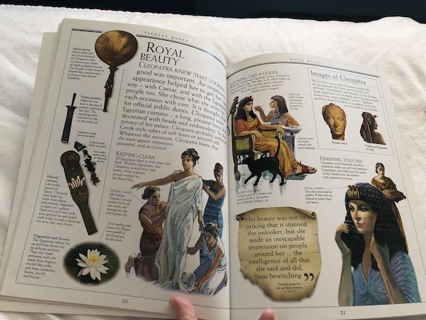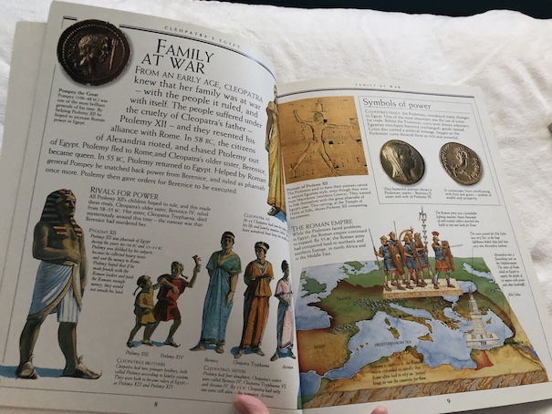 This particular book is about the life of Cleopatra, the famous Egyptian queen. The queen we know as simply Cleopatra was actually Cleopatra VII. She was part of a dynasty of Egyptian rulers who were originally from Macedonia, a region of Greece. This dynasty was known as the Ptolemaic Dynasty because all of the kings in the dynasty were named Ptolemy, including Cleopatra’s father, Ptolemy XII. There were certain names that were repeated in every generation of the family and even within generations, like Ptolemy (Cleopatra’s two brothers both had this name), Cleopatra (Cleopatra also had a sister who was also named Cleopatra), and Arsinoe (Cleopatra’s younger sister). The book doesn’t fully explain why they came from Macedonia, but one of Cleopatra’s ancestors, Ptolemy I, was a Macedonian nobleman and a friend of Alexander the Great. Ptolemy I went with Alexander the Great on his military campaigns. Through his service to Alexander the Great, Ptolemy I was made the Greek governor of Egypt, ruling from the city Alexandria, which had been established by Alexander the Great. Alexandria was an important port city as well as the seat of the royal family. It was a gathering place of traders, scholars, and people from different cultures in Egypt, although average Egyptian citizens viewed it more as city of foreigners, just as the royal family itself was also foreign. That’s an abbreviated explanation of the family’s history, but it helps to understand that, while the family ruled Egypt for generations, they remained culturally Greek. The book mentions that most of the members of Cleopatra’s family only spoke Greek and that Cleopatra departed from the norm by learning to speak Egyptian.