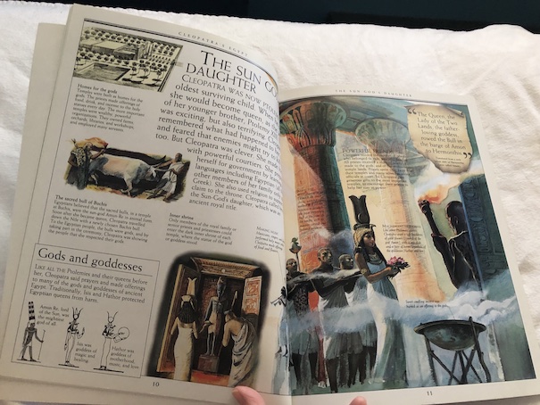 Something I particularly liked about this book was the separation between the legends of Cleopatra and the her known history. As with other ancient historical figures, the history and legends go hand-in-hand, and it can become difficult to separate the two. The book is pretty open about which parts of her life are known, what can’t be firmly established, and which parts of her story come to us from legend and may or may not be reality. The final section in the book discusses the known facts and fiction about Cleopatra and possible confusions between her and other Cleopatras in her family (which may be another reason why not all of the images of Cleopatra look alike). It also explains the information about Cleopatra in Plutarch‘s biography of Mark Antony and how his stories inspired Shakespeare’s play and modern movies about Cleopatra.