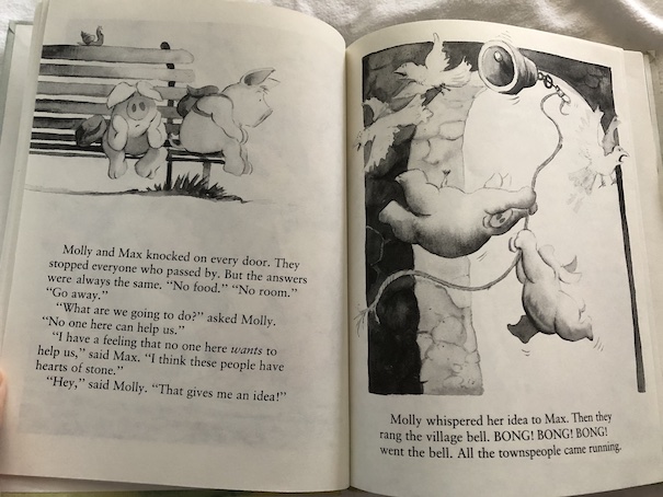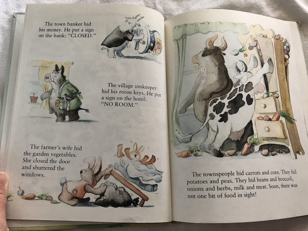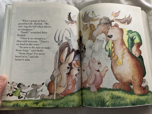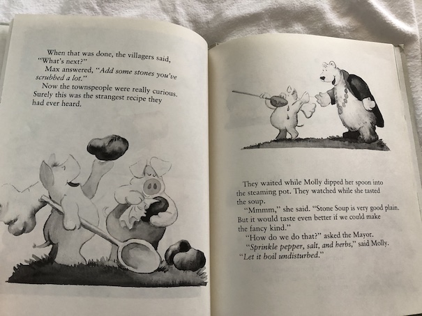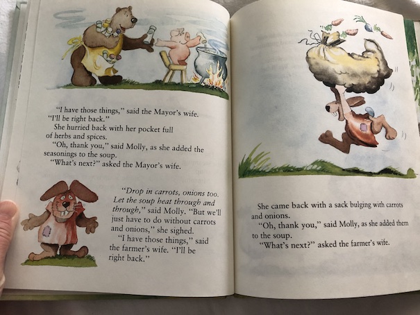 Little by little, Molly and Max coax the villagers into supplying other ingredients, almost without realizing what they’re doing. In the end, the Mayor of the village says that it’s the best soup he’s ever tasted, and it’s amazing, considering that it was only made with stones and water.