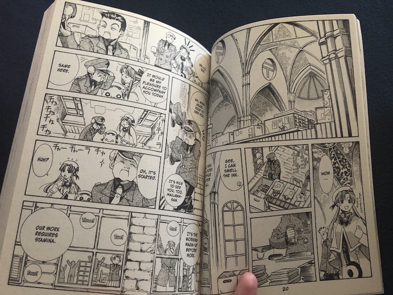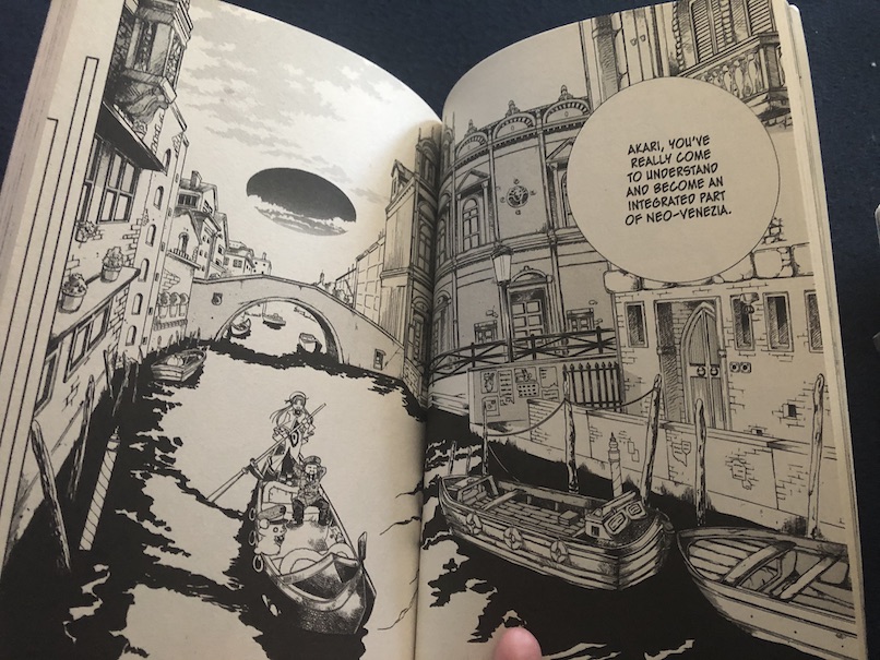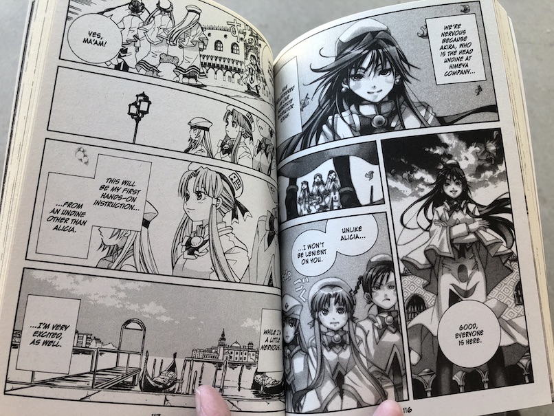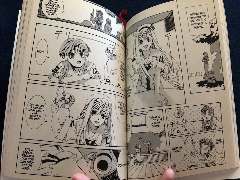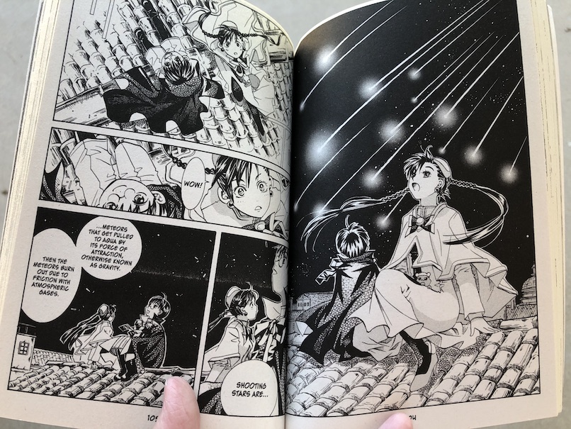This is the fifth volume of the second part of a fascinating manga series that combines sci-fi, fantasy, and slice of life. The series takes place about 300 years in the future, when Mars has been terraformed and renamed Aqua (because of all the water on its surface). The human colonies on Aqua are designed to resemble old-fashioned cities on Earth (called Manhome here). The people of Aqua prefer a much slower pace of life than people on Manhome, and aspects of life on Aqua more closely resemble Earth’s past.