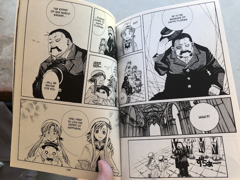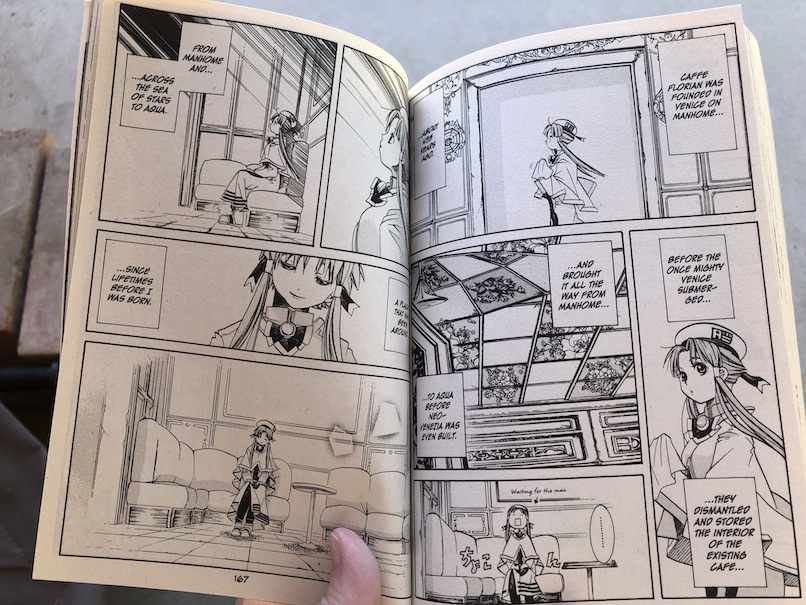Akari reflects on the history of the cafe, Caffe Florian, which she says is actually the same cafe that once stood in the original Venice (which, in Akari’s time, is now submerged beneath the ocean), having been dismantled and moved years ago.