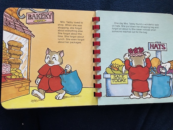 Sniffy books or scratch-and-sniff books were a new development during the 1970s, and they remained popular through the mid-1980s, along with scratch-and-sniff stickers. This particular book features characters from Richard Scarry‘s Busytown series, especially Lowly Worm. The first part of the book has Lowly and his friend Huckle Cat looking at a sniffy book and teaching readers how to use the scratch-and-sniff parts of the picture.