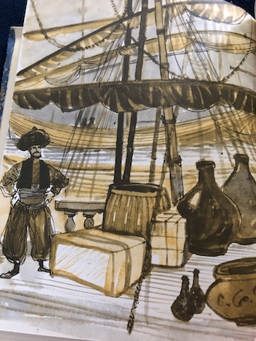We also get to see Rainbow eating in a city restaurant rather than the small town or countryside taverns where he has been before. I found the description of the restaurant interesting. It was one of the places where I though that Rainbow might be refused service at first, but he encounters no difficulties there. What particularly fascinated me about the restaurant is that all the food is pre-made and on display for people walking in to select what they want to eat. Foods that don’t need to be kept hot, like pies and sandwiches, are simply laid out on the counter, and hot dishes are kept behind the counter, warmed by “spirit lamps.” It seems almost like modern fast food, being kept warm under heating lamps. Rainbow just tells the restaurant staff what he wants from the foods he sees, and they give it to him. I see the benefits of this system because, especially in an era without microwaves to quickly warm up food, people can’t wait for dishes they just ordered to be cooked from scratch. Things need to be prepared when they come in. I just didn’t expect it to be so similar to the methods we use for modern fast food. I am a little concerned that the foods that are simply laid out on the counter, like sandwiches with cold meat in them are not being kept at a proper temperature, but it may not matter if they are not there for long because customers claim them pretty quickly.