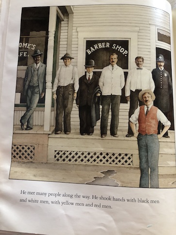 Rainbow has a more difficult time going to sleep than Handie does, thinking about everything that’s happened and how strange it feels to be away from home. Both of the boys are becoming young men and venturing out into the world without their families for the first time, but in some ways, Rainbow’s position feels more precarious than Handie’s because he never knows how the people he meets might react to him, just because of his race. The book says:
