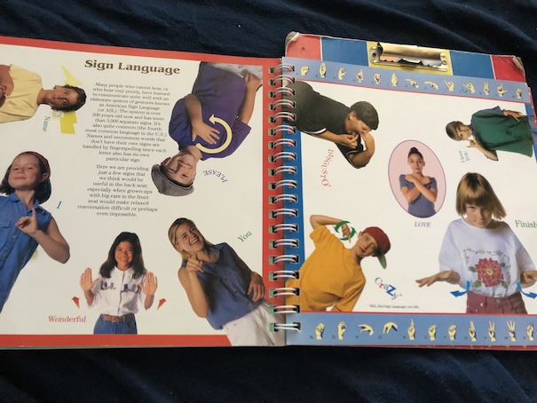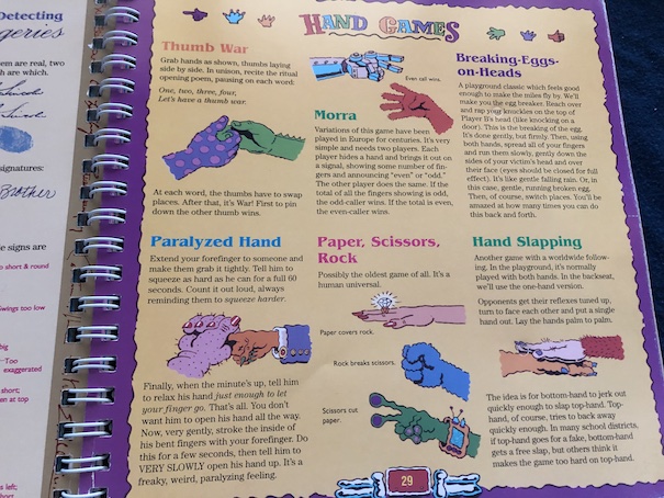 The activities in the book are meant to be done in a car. In the front of the book, there’s a section where you can record which license plates you’ve seen from different states in the US. (A common car activity on US road trips because there are 50 states, and they all have different styles of license plates. In theory, you could see examples of plates from all 50 states in a single, long car trip, but I never did. I’ve seen most of the states during a single trip, but I’ve never been table to check off all of them during a single trip.) There are also rules for playing many classic car games, mostly games that involve talking or hand motions or can be played on paper, like Twenty Questions, Paper, Rock, Scissors, and Hangman. It also describes popular car trip rituals, like holding your breath while passing a graveyard, lifting your feet while going over a bridge, or ducking your head while going under a bridge.