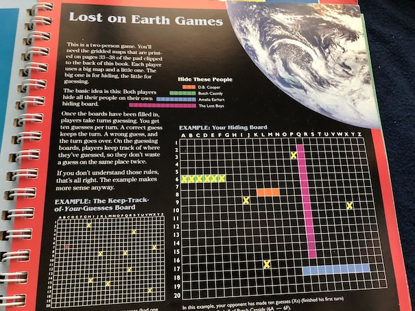 The Lost on Earth games are especially funny when you know the references for who the missing people or what the missing things are, like who Amelia Earhart or D.B. Cooper is/was. When I was a kid, I didn’t know about D.B. Cooper (this YouTube video from Buzzfeed Unsolved explains), but I think one of the missing people on the activity pad grids was Jimmy Hoffa, and I knew that name (Buzzfeed Unsolved also covered that). The great thing about these references is that, if you’re playing this game with a kid who hasn’t heard of some of these people or things, just explaining who or what they are is activity by itself.