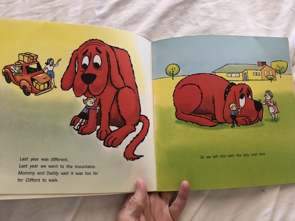 Like all Clifford books, the humor is based around Clifford’s enormous size. Even though the family thought that it would be too far for Clifford to walk to come to the mountains with them, he tracks them down there anyway. Then, after he rejoins his family, he sleeps with Emily Elizabeth, his ear propped up to be her tent. The idea they’re considering next for transporting Clifford is a flat-bed truck. I could well imagine my own dog trying to track me down if I went on vacation without her, but fortunately, when your dog is about the same size as Toto in the Wizard of Oz, traveling with a dog isn’t as difficult.