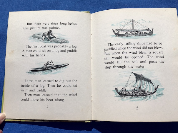 The book starts off by explaining how early sailors might have traveled. It speculates that people first realized that they could travel by water by floating on logs and then realizing that they could carve those logs into canoes and paddle them to move in the direction they wanted to go, eventually adding sails to move even faster with less effort.