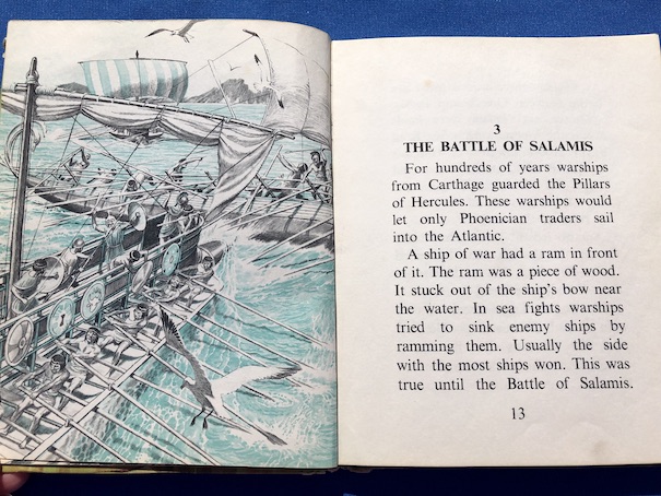 It then describes how ancient civilizations such as the Egyptians and Phoenicians traveled by ship. There is a chapter about Hanno of Carthage, a Phoenician who commanded a fleet of ships and was known for sailing around the coast of Africa. (That section and the next one use the old name for the rocks at the Strait of Gibraltar, the Pillars of Hercules.) The next chapter describes the Battle of Salamis between Greece, led by Themistocles, and Persia, led by Xerxes. This battle is particularly notable because the Greeks defeated the Persians through a clever trick even though they were out-numbered, proving that a good battle strategy could allow even smaller fleets to gain the upper hand in battle. There is also a chapter about Pytheas, a Greek sailor who sailed to Britain in search of tin and “Thule” (it’s not completely clear what he meant by Thule, although it was apparently a place north of Britain) and wrote a book about his travels.