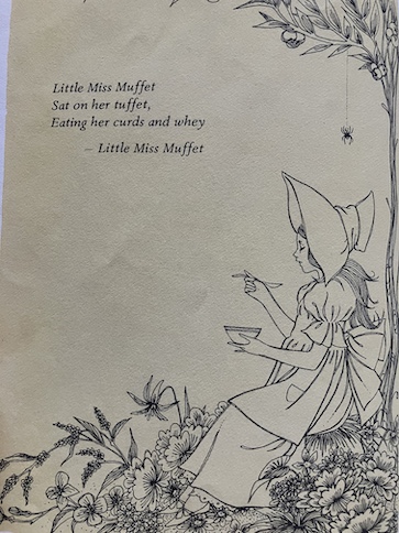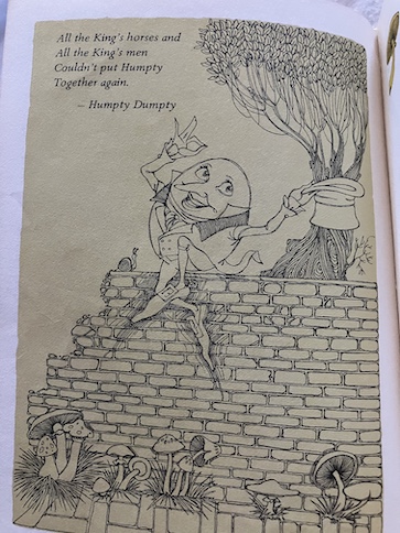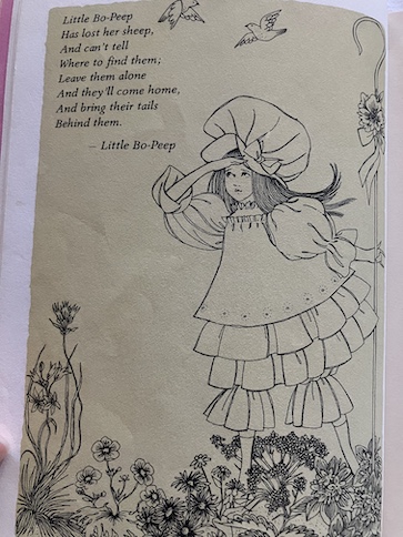 The recipes in the book are sorted in alphabetical order, skipping a few letters of the alphabet that they didn’t have recipes to match. Each of the recipes is accompanied by a pen-and-ink picture of the nursery rhymes or fairy tale connected to the recipe, and the pictures are on backgrounds of varying shades of purple and light green.